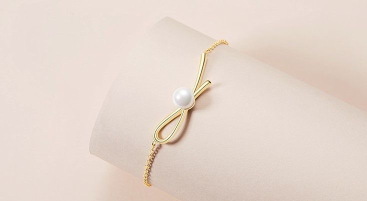 The design is beautiful and simple in nature, featuring an asymmetrical bow shape with a natural pearl holding the bow together. It can be worn daily or even just for a special celebration. On wearing the bracelet, one can visualize wearing a dancing butterfly in a wary stance. Molded of sterling silver and plated with real gold, the bracelet makes for a classic addition to your wardrobe. It is available in a standard 14 cm + 5 cm extra if required. You can also find its counterpart – The Pearl Knot Necklace here.